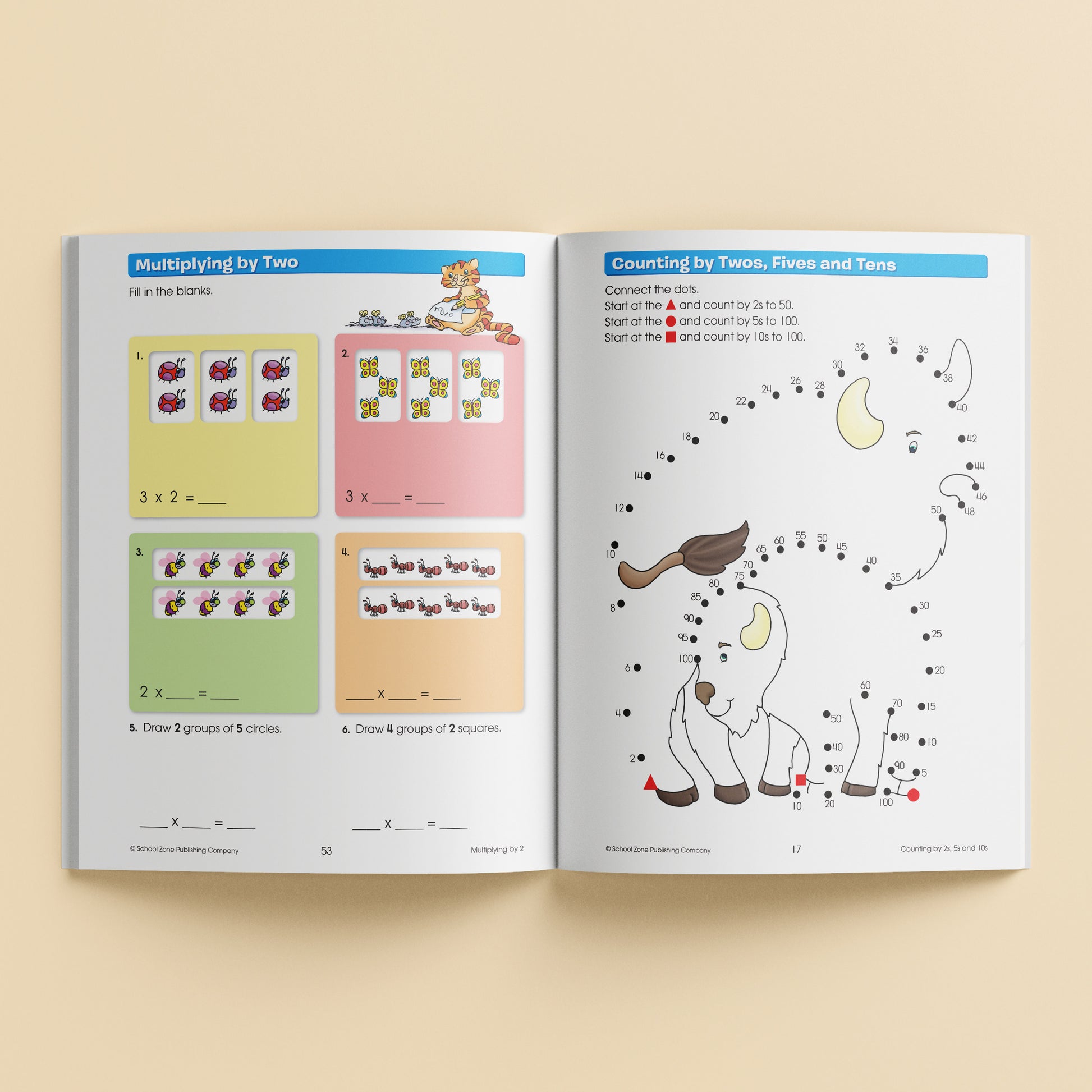 The lessons in this workbook cover skills including understanding and comparing three-digit numbers, addition and subtraction facts, adding and subtracting with two- and three-digit numbers, understanding multiplication facts to the fives, and more.